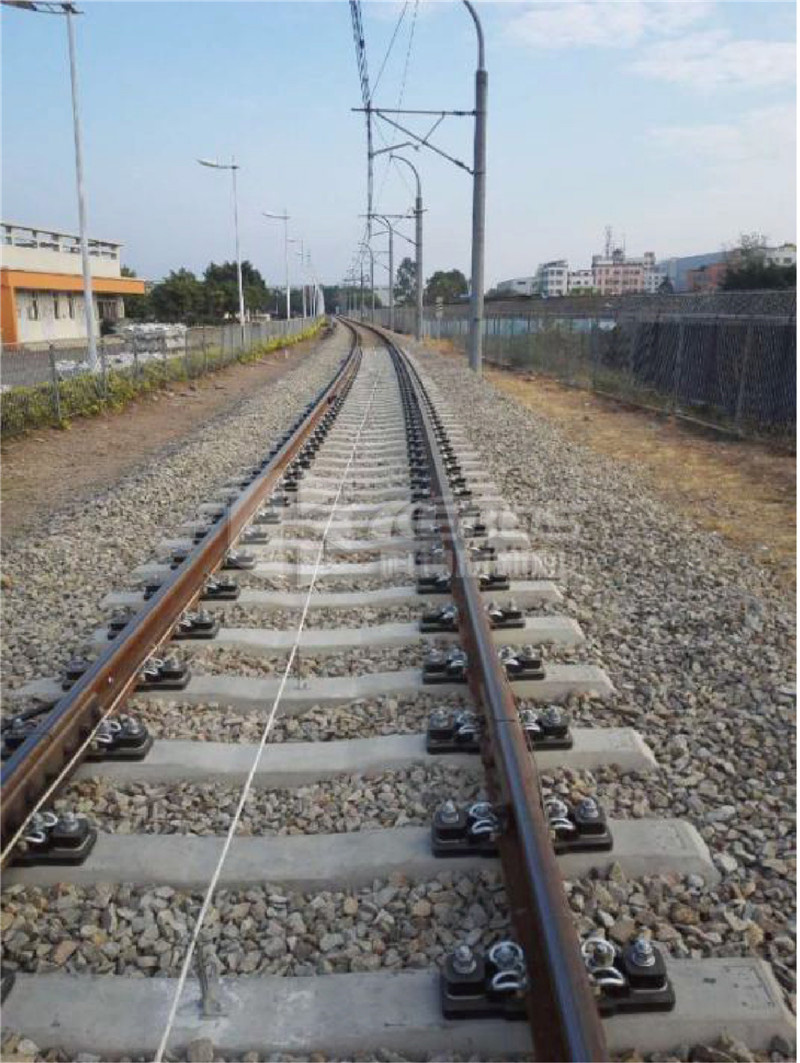 預埋式雙層非線性減振扣件主要由預埋鐵座、中間橡膠墊板、鐵墊板、軌下橡膠墊板以及彈條系統等組 成,屬于中等減振扣件范疇,具有優異的動態減振性能,相較于普通彈性分開式扣件減振達8dB以上, 可廣泛地應用于城市軌道交通線路中。